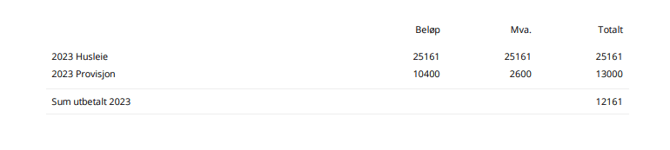 • Rapporten inneholder husleie, provisjon og sum utbetalt.