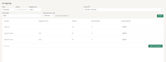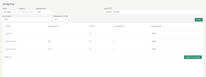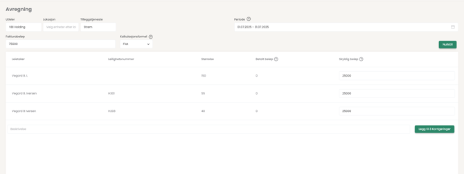 Se bildet nedenfor for et eksempel der kr. 75.000 er fordelt flatt, noe som resulterer i kr. 25.000 per leietaker