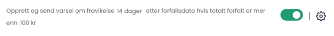 Legg inn antall dager du ønsker at systemet skal automatisk opprette og sende ut et fravikelsesvarsel (4-18 varsel) til leietaker. Her kan dere ha som tidligst 1 dag etter forfallsdato, men normen er 7-14 dager.