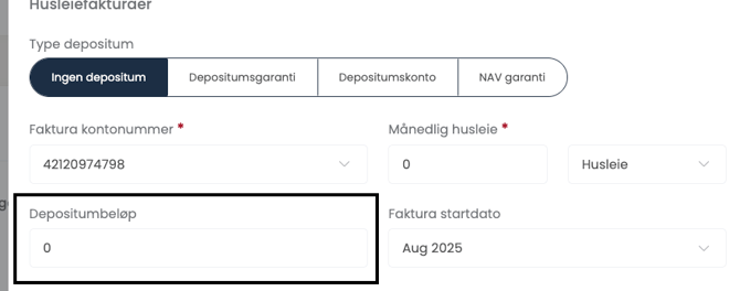 - Om det tilhører depositumskonto til objektet, velg type «Inget depositum» og fyll i depositumsbeløpet i feltet vist i bildet: