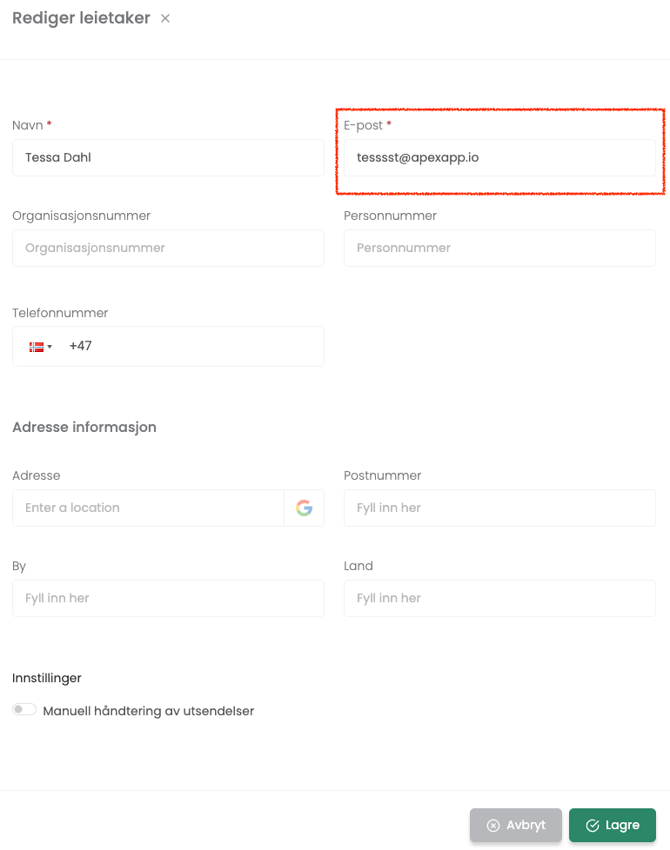 Dersom leietaker har endret e-post, eller e-posten har blitt feil, så går vi igjennom hvordan man endrer e-post på leietaker her.