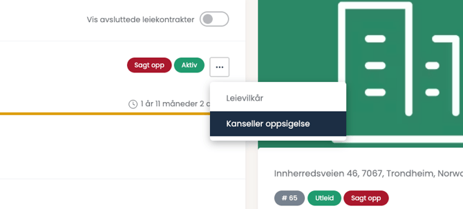 Merk at dersom leieforholdet allerede er sagt opp, så kan du ikke endre sluttdato uten å kansellere oppsigelsen først. Dette gjør du gjennom å klikke på de tre prikkene på leieforholdet, og velg "Kanseller oppsigelse".