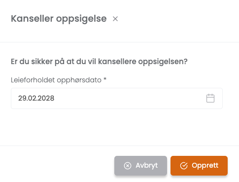- Oppsigelsen er nå kansellert, og leieforholdet har den nye sluttdatoen dere har fyllt i.
