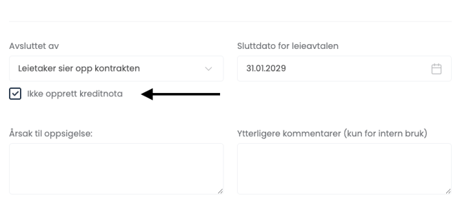Om du ikke huker av "Send varsel" lengst ned, så blir ikke noe e-post sendt til leietaker. Dersom du kun skal endre sluttdato frem i tid, men ikke si opp, så er dette gunstig. - Funksjonen "Ikke opprett kreditnota" er kun relevant dersom du skal avslutte et leieforhold nært i tid, og fakturaen for måneden du sier opp allerede har blitt sendt ut. Om du endrer et leieforhold lenger frem i tid, så er denne innstillingen derfor ikke relevant.