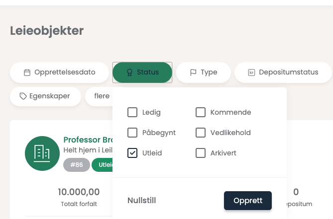 - Gå inn på «Leieobjekter». Her kan du velge å sortere på den informasjonen som du ønsker ha med. Velg de relevante filtrene gjennom å klikke på de og fylle inn de alternativ du vil sortere på.