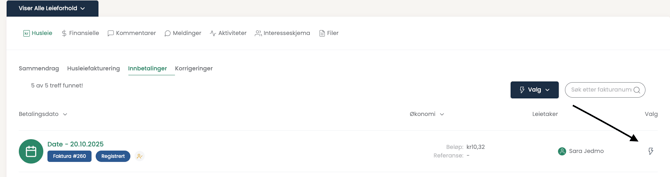 - Under «Husleie», gå til «Innbetalinger» og lokalisere innbetalingen som har blitt gjort med ører.