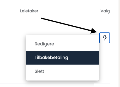 - Klikk på lynet lengst til høyre på innbetalingen det gjelder, og velg "Tilbakebetaling":