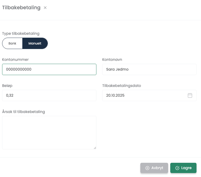 - Skriv inn summen på ørene du skal registrere som tilbakebetalt som en manuell tilbakebetaling. Fyll i kontonummer og årsak til tilbakebetaling, og velg «Lagre».