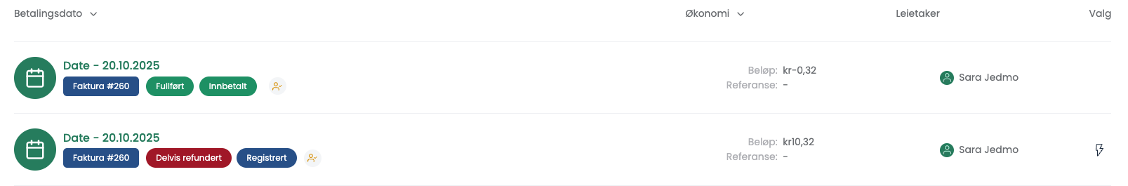 - Under «Husleie», gå til «Innbetalinger» og lokalisere den seneste innbetalingen. Dersom det er en eldre innbetaling som har blitt innbetalt med ører, så er det fortsatt best å betale tilbake på den seneste innbetalingen. Dette er for at pengene flytter seg til nyere fakturaer automatisk når de blir opprettet.