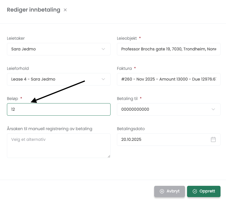 - Fjern ørene fra innbetalingen under «Beløp», så det kun står hele kroner igjen, og klikk på «Opprett»: