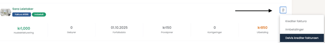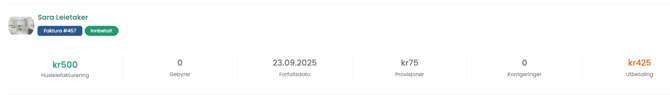 - Fakturaen blir nå kreditert, og en ny faktura på riktig sum opprettes. Merk at det tar noen minutter før systemet har regnet ut provisjon og utbetaling. Oppdater siden for å få de synlig.