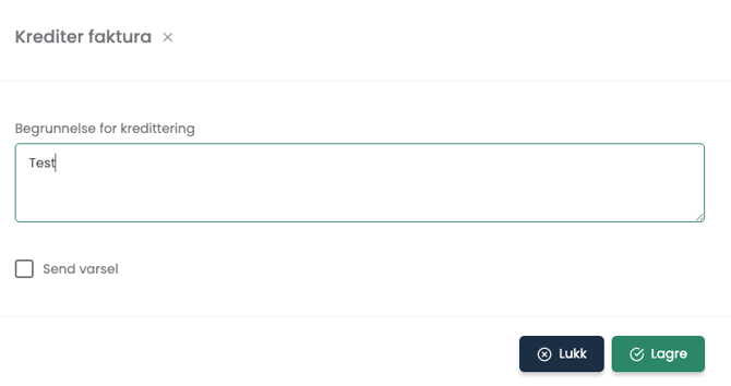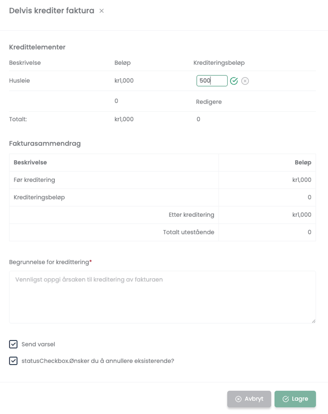 - Skriv inn begrunnelse for kreditering, velg om du vil sende varsel til leietaker eller ikke, og velg «Lagre»: