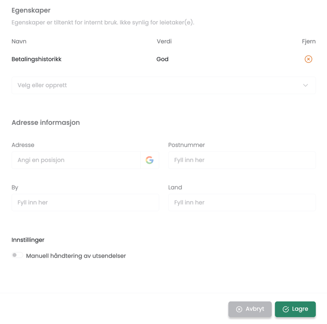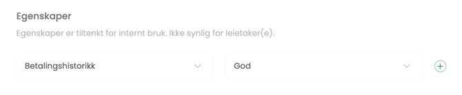 Når du får opp redigeringsbildet kan du scrolle ned til egenskaper. Her vil dere ha mulighet til å legge inn alle egenskaper som dere ønsker. Disse vil følge leietaker helt til dere aktivt går inn og fjerner egenskapen. Disse egenskapene vil kun være synlig for dere, leietaker vil ikke se dette på noe tidspunkt.