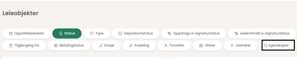 Du kan og søke på egenskaper gjennom å sortere på «Egenskaper» i listen, og velge egenskap og standard .