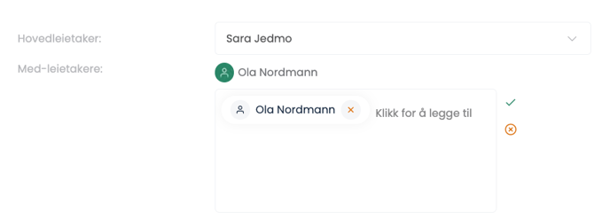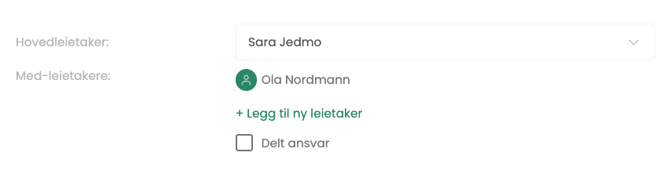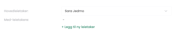 - Her ser du at vi har delt opp “Hovedleietaker” og “Medleietaker”. Dersom det er en medleietaker du skal legge til trykker du på “+Legg til ny leietaker”.