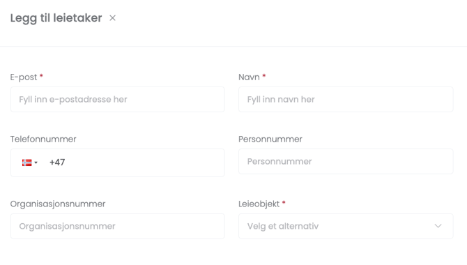 - Her må du fylle inn E-post og navn på leietakeren du ønsker å legge til. Hvis du har personnummer og telefonnummer kan du legge til dette også. Til slutt må du koble leietakeren til et leieobjekt, da trykker du på nedtrekksmenyen og begynner å skrive inn adressen til leieobjektet. Når du har gjort dette trykker du på “Opprett”.