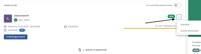 - Videre går du inn på det leieobjektet du ønsker å legge til en leietaker. Trykk på de 3 prikkene på høyre side av leiekontrakten også velger du “Leievilkår”.