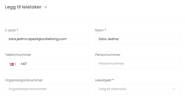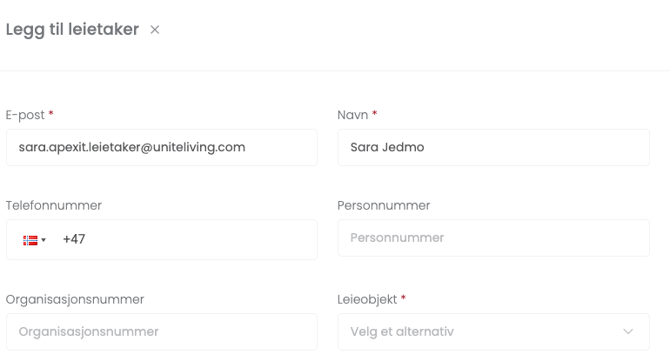 - Fyll inn resterende informasjon om leietakeren, og trykk på lagre.