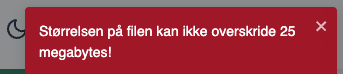 - Dersom du prøver å laste opp en for stor fil, eller en fil som ikke er i PDF format, så får du feilmeldingen "Størrelsen på filen kan ikke overskride 25 megabytes!". Velg en mindre fil, eller dobbeltsjekk at filen er i PDF format.