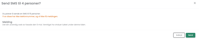 - Du får nå en oversikt over teksten du sender, og hvor mange du prøver å sende til. Du får igjen info om noen savner telefonnummer på brukeren sin.