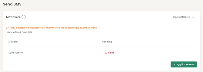 Dersom noen mangler telefonnummer, så blir du informert om dette. Velg "Vis Mottakere" hvis du ønsker en liste på de som blir å motta SMS. Du kan og velge å legge til enda fler mottakere, gjennom å klikke på <+ Legg til mottaker>.