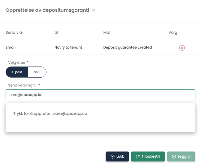 - Velg om du ønsker at varslingen skal være på e-post eller SMS, og fyll i e-post eller telefonnummer under "Send varsling til", og trykk Enter: