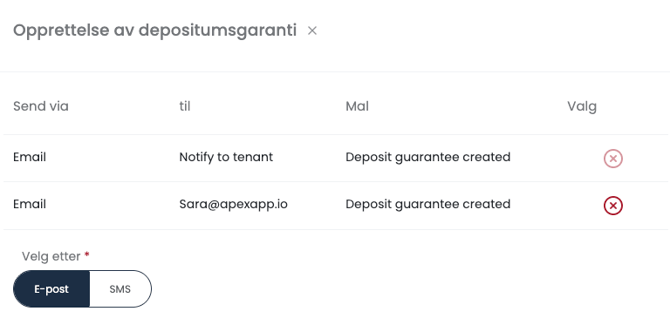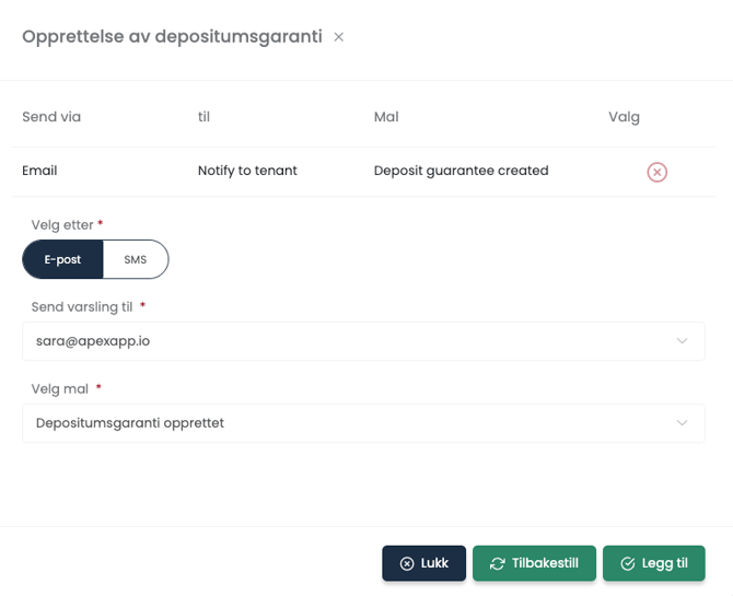 Det finnes flere varslinger som sendes av systemet til leietaker/utleier/megler/bruker, for eksempel ved signering av leiekontrakt, oppsigelse av kontrakt osv. Disse skjer automatisk, men du kan og legge inn ekstra varslinger manuelt, samt velge om du ønsker å sende de via e-post eller SMS.